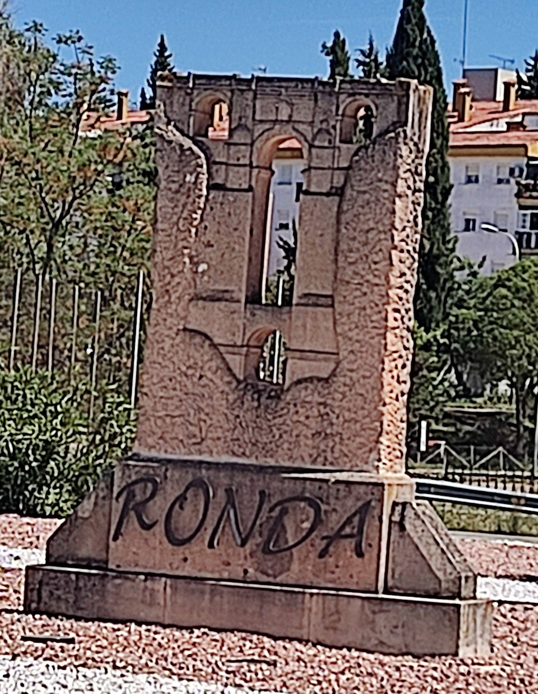 Back onto the main road and the next entrance into the City of the Tajo is the North West entrance. Here is a roundabout with a sculpture of the Puente Nuevo, the emblematic symbol of Ronda.