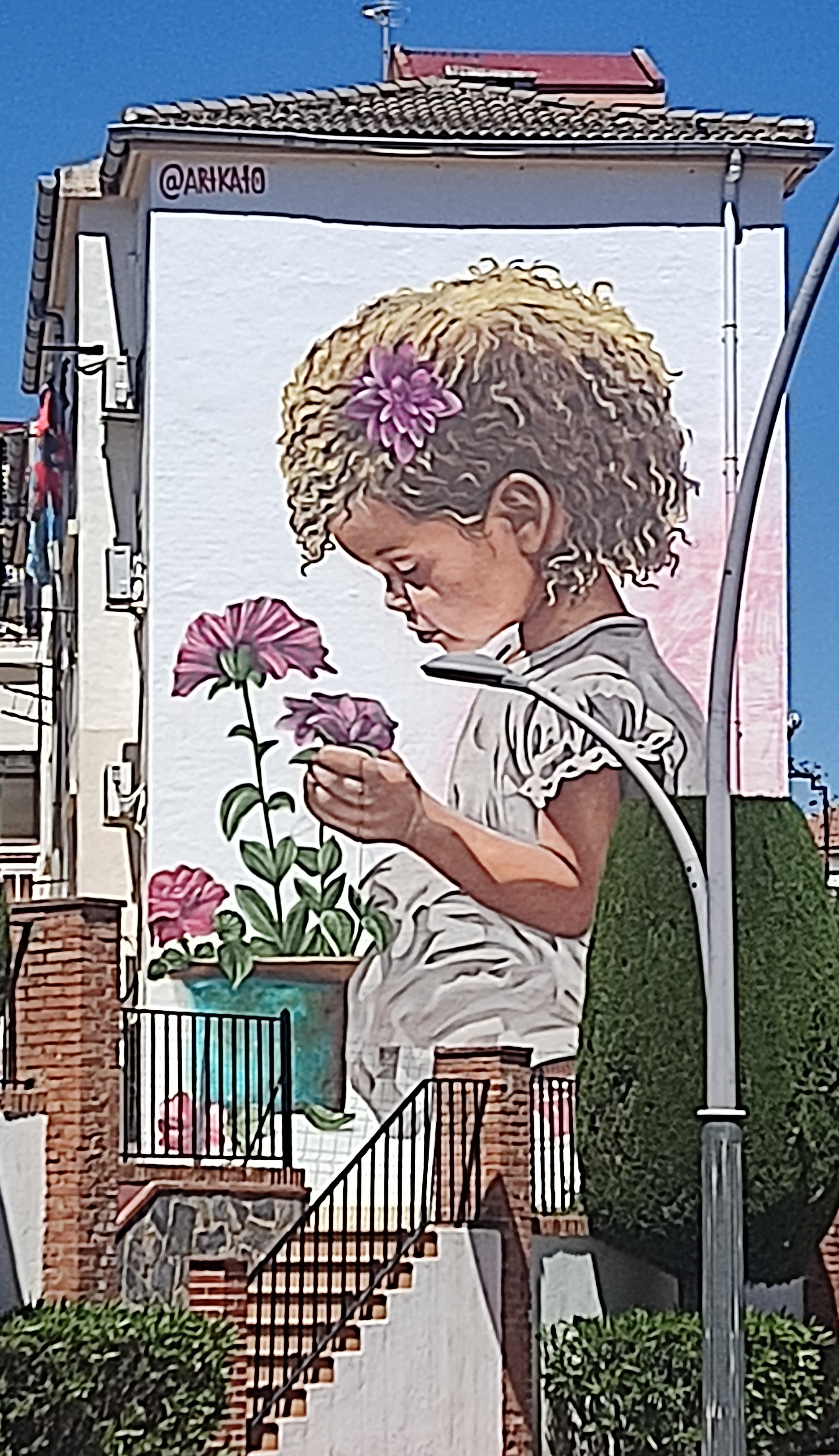 Further on, on the other side of the road, is a splendid rendition on an end wall of a Spanish señorita, the third mural in the town by artist Óscar San Miguel, also known as Okuda.